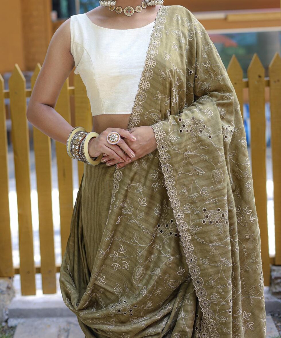 Drape yourself in luxury with this Pure Soft Silk Saree, exquisitely adorned with beautiful thread handwork. It showcases an elegant floral design complemented by a sophisticated cutwork border, creating a harmonious and graceful look. The saree features this elegant design meticulously spread all over, ensuring a stunning appearance. This timeless piece, perfect for any special occasion, is available for ₹4,899.00.